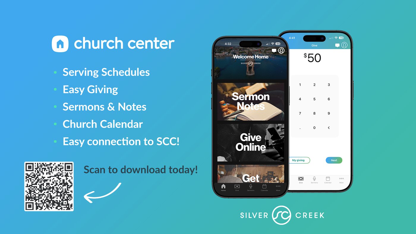 If you haven't already done so, check out the Church Center App! It's an easy to use place to stay connected to everything happening here at Silver Creek Church! You can watch & listen to past sermons, access sermon notes & the livestream, give online & see giving statements etc., check out the Church Calendar, submit prayer requests and more! Click the button below to download the App - you'll be asked for your phone number to verify your identity and logged in! If you have any questions about the app or trouble getting it set up, please reach out to Pastor Ben.